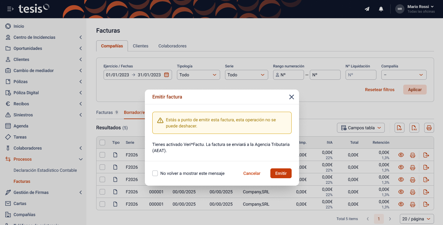 Tesis Broker Manager permitirá que una correduría emita la facturación de los colaboradores, gracias a la posibilidad que ofrece VERI*FACTU de facturas delegadas. Esta opción va ligada a un acuerdo entre la correduría y el colaborador, además es parametrizable. También permite que los propios colaboradores puedan emitir sus facturas a partir de los borradores, a través de VERI*FACTU, de forma delegada, siempre y cuando dispongan de la autorización correspondiente. |