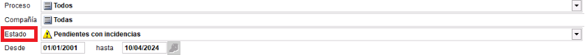 Posteriormente seleccionaremos el filtro de Estado y pondremos la opción Pendientes con incidencias, así solo me seleccionará aquellos ficheros que tengan cualquier tipo de incidencia.