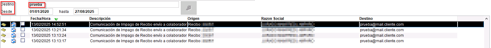 Podremos filtrar así mismo por Destino, es decir, la dirección de correo electrónico a la que se realizan los envíos de las tareas, así como por fechas para acotar aún más nuestra búsqueda.